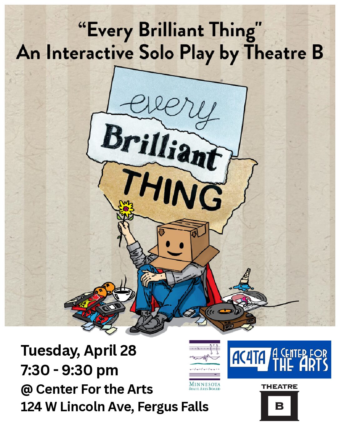 Every Brilliant Thing is a powerful, heartwarming, and surprisingly funny play about the lengths we go to for those we love—and the small, beautiful moments that make life worth living.